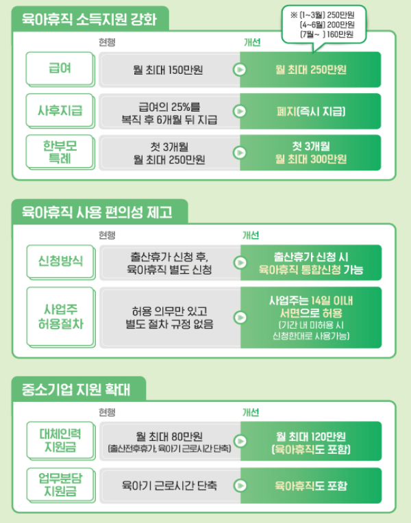 정부는 월 최대 150만원인 육아휴직급여를 최대 250만원까지 인상하겠다고 발표했습니다.